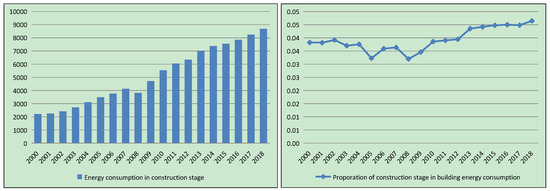 According to the statistical yearbook, the energy consumption of the construction industry mainly refers to the energy consumption of construction units, construction installation, main projects, temporary projects, affiliated industrial production units, and part of the building operation stage. Here, the energy consumption of each project and the affiliated industrial production unit are counted into the construction stage. Energy consumption of the construction industry in the statistical yearbook is used to represent the energy consumption in the construction stage:
