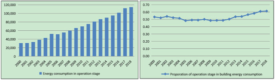 - The operation stage not only takes up most of a building’s energy consumption, it also makes the greatest contribution to the growth of Chinese buildings’ energy consumption from 2000 to 2018. Therefore, it is essential to control building energy consumption in the operation stage. Except for the design and application of new eco-friendly technology, an effective way to reduce building energy consumption in the operation stage may be to enhance people’s awareness of energy conservation in their daily life.