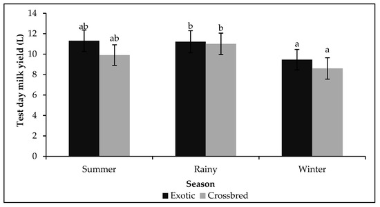 Least square means with corresponding standard errors for test day milk yield (MY) of exotic and crossbred cattle in different seasons. Least square means with different superscript differ significantly (p < 0.05). Significant differences (p < 0.05) within each breed group between seasons are denoted as a,b. Differences within each season group between the breeds were not statistically significant (p > 0.05) and therefore are not shown in the figure.
