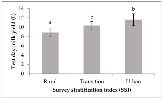 Least square means for MY across the rural–urban interface as defined by SSI are shown in Figure 2. Test day MY was significantly lower in the rural (8.84 ± 0.79 L/day) than in the transition (10.33 ± 0.90 L/day) and urban (11.58 ± 1.28 L/day) areas. The difference in test day MY between the transition and urban area was not significant.