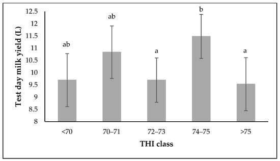 Least square means with corresponding standard errors for test day milk yield (MY) across temperature humidity index (THI) classes. Least square means with different superscript differ significantly (p < 0.05).