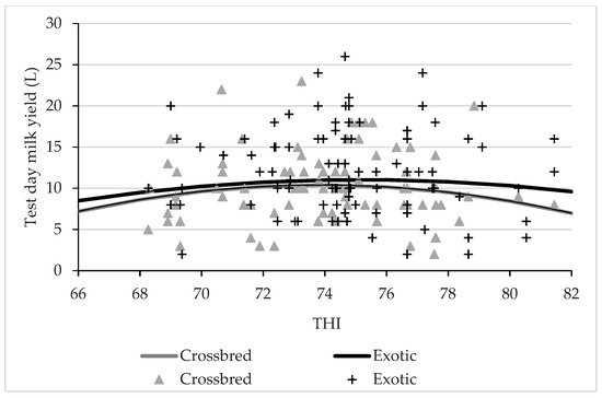 The quadratic regression curves analyzed with model 2 for test day MY by THI are depicted in Figure 4 for both crossbred (y = −0.0516x2 + 7.6221x − 271.12) and exotic cattle (y = −0.0305x2 + 4.5888x − 161.35). In agreement with the results for THI class effects (model 1), MY was lowest at the extreme ends of the THI scale. The MY by THI pattern was very similar for both crossbred and exotic cows. Nevertheless, the MY of exotic cattle (10.71 ± 0.89 L) was higher than the MY of crossbred cows (9.89 ± 0.86 L) across the THI range. Table A1 presents the results of the test of significance, R2, and RSME for the regression analysis studying MY responses on THI from model 2.