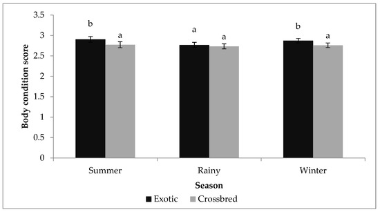 Least square means with corresponding standard errors for body condition score (BCS) of exotic and crossbred cattle for different seasons. Least square means with different superscript differ significantly (p < 0.05). Significances within each breed group across seasons are denoted as a,b. Differences within each season group between the breeds were not statistically significant (p > 0.05) and therefore are not shown in the figure.