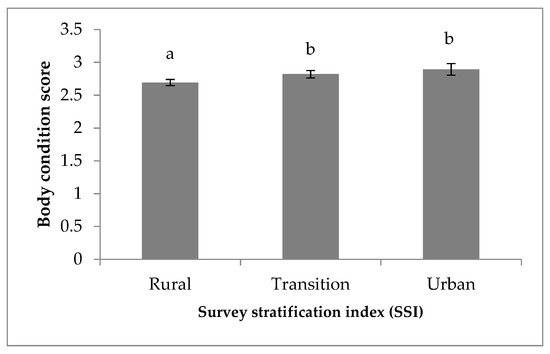 The SSI significantly (p < 0.05) affected BCS across the rural–urban interface (Figure 6). The least square mean for BCS was significantly higher (p < 0.05) for cows located in the urban (2.89 ± 0.09) and transition areas (2.82 ± 0.05) compared to cows in rural areas (2.69 ± 0.05).
