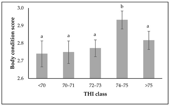 Least square means with corresponding standard errors for body condition score (BCS) across THI classes. Least square means with different superscript differ significantly (p < 0.05).