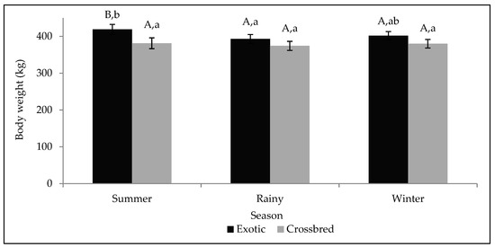 Least square means with corresponding standard errors for body weight (BW) of exotic and crossbred cattle for different seasons. Least square means with different superscript differ significantly (p < 0.05). Significant differences (p < 0.05) within each season group between the breeds are denoted as A,B, while significant differences (p < 0.05) within each breed group across different seasons are denoted as a,b.
