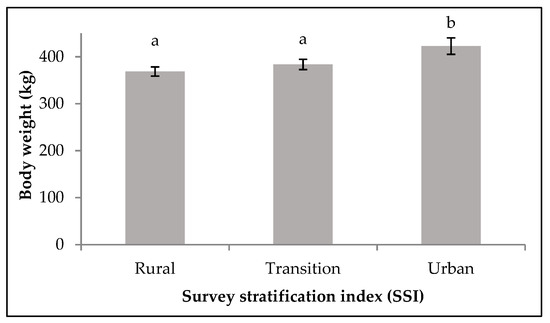 Least square means with corresponding standard errors for body weight (BW) in rural, urban, and transition areas of Bengaluru. Least square means with different superscript differ significantly (p < 0.05).