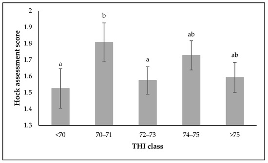 Least square means with corresponding standard errors for hock assessment score (HAS) across the THI classes. Least square means with different superscript differ significantly (p < 0.05).