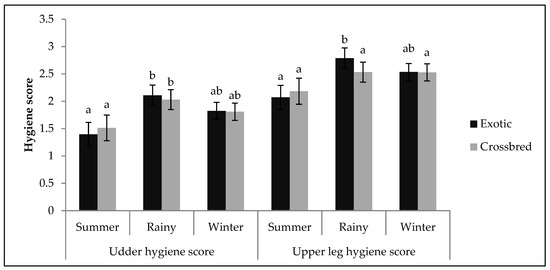 Least square means with corresponding standard errors for udder hygiene score and upper leg hygiene score for different seasons. Least square means with different superscript differ significantly (p < 0.05). Significant differences (p < 0.05) within each breed group between seasons are denoted as a,b. Difference within each season group between the breeds was not statistically significant (p > 0.05) and therefore is not shown in the figure.