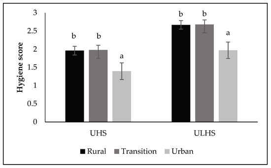 Least square means for UHS and ULHS across the rural–urban interface are shown in Figure 12. Cattle housed in the urban area had significantly (p < 0.05) better hygiene scores of 1.40 ± 0.23 (UHS) and 1.97 ± 0.23 (ULHS) when compared to cows from the rural (1.96 ± 0.12 (UHS) and 2.67 ± 0.12 (ULHS)) and transition (1.98 ± 0.13 (UHS) and 2.68 ± 0.13 (ULHS)) areas. The differences of least squares means for UHS and ULHS across THI classes were not significant (p > 0.05).