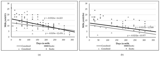 Regression lines (including equations) and raw data points for test day milk yield (MY) by days in milk in exotic and crossbred cattle in groups (a) THI ≤ 75 and (b) THI > 75.