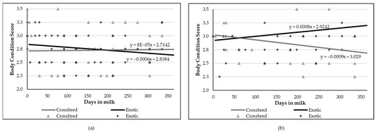 Regression lines (including equations) and raw data points for BCS by days in milk of exotic and crossbred cattle in case of (a) THI ≤ 75 or (b) THI > 75.