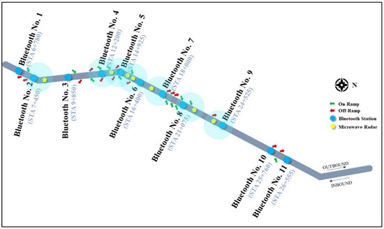 Along its length, the Don Muang Tollway has 11 stations installed with two Bluetooth detectors/station for inbound and outbound traffic. The average distance between adjacent stations is in the range 0.5–4 km, as shown in Figure 1. The specification and technology of the Bluetooth detectors are given in Table 1.