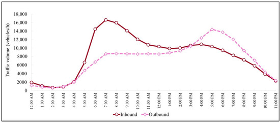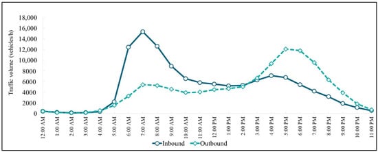 According to the traffic counts from the microwave radar devices in October 2020, the inbound and outbound traffic volumes had different patterns, with the inbound traffic peaking from 6:00 a.m. to 9:00 a.m. and the outbound direction characterized by a peak from 4:00 p.m. to 7:00 p.m., as shown in Figure 3. This pattern indicates the characteristics of commuter traffic between the northern suburbs and central Bangkok served by the Don Muang Tollway.