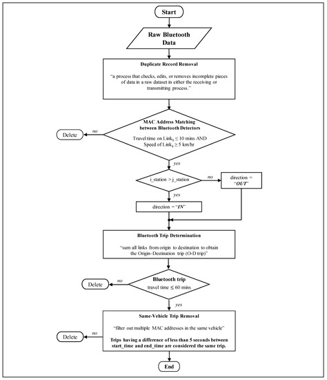 As mentioned in [20], one MAC address does not necessarily represent an individual vehicle because there might be multiple Bluetooth devices in a vehicle. Furthermore, driving behavior and other factors can cause errors in data collection that affect the penetration-rate analysis. Therefore, data-cleaning and -filtering processes were required before performing further analysis. In the data processing, duplicate MAC addresses were removed to obtain only one value representing a vehicle, which was then used to perform node-to-node (station-to-station) analysis, and consequently to create a trip model for each MAC address.