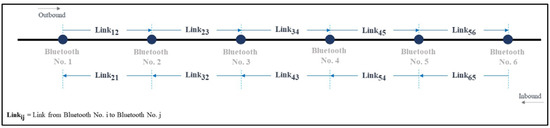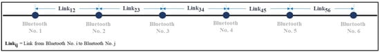 Efficient traffic-data collection is necessary to estimate and manage the traffic condition and lessen congested road networks in large developing cities that have toll-road networks and complicated main- and sub-routes. Conventionally, traffic data such as traffic volume, origin–destination data, travel period, and speed of traveling for different time periods are manually collected through surveys. Nowadays, various technologies can be used to collect traffic condition data for most survey research studies. For example, recent studies [1,2] used vehicle trajectory data from smartphone and GPS-equipped vehicles to estimate travel behavior and road traffic conditions. Mobile phone location data are also used to estimate travel time and the origin–destination matrix [3,4,5]. Among the many choices of detecting devices, with wide ranges in cost and implementation time, low-cost Bluetooth technology is one of the most popular and has been extensively embedded in several essential devices such as smartphones, car stereo speakers, wireless headphones, and other gadgets used in our daily life. Unlike GPS-equipped vehicles, Bluetooth detectors do not rely on individual vehicles to send location data to a central system. Using Bluetooth devices as traffic detectors is also non-intrusive and more affordable compared to other types of sensors. In addition, Bluetooth detectors are less sensitive to low light and inclement weather compared to an automatic license-plate recognition approach [6]. Consequently, Bluetooth detection technology has become a preferred means of major traffic data collection to support the analysis of traffic conditions on many road networks globally.