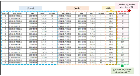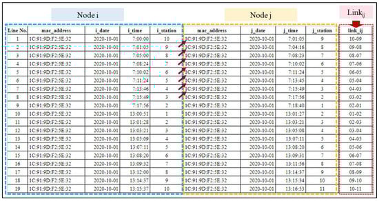 First, the data were sorted by the three attributes mac_address, ref_time, and device_id, respectively. Next, we defined linkij for each MAC address as a pair of records with the same MAC address between stations i and j, as shown in Figure 5.