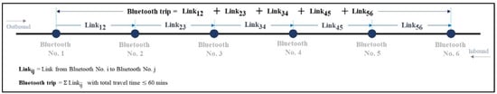 In this step, we constructed each trip by summing all links from the origin to the destination to obtain the origin–destination trip (O-D trip); that is, a trip made up of a collection of the links determined in Section 4.1.2. Figure 9 illustrates the trip derived from the sequence of links.