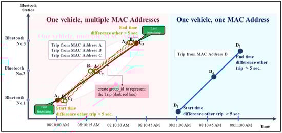 To identify multiple trips that were potentially from the same vehicle, we reordered the trips according to time, grouped these trips into the criterion of a 5 s difference, and indexed the representative of all the other trips with the group_id (the red line in Figure 11). The start_time (first timestamp) of the representative is the minimum value and the end_time (last timestamp) is the maximum value of all trips in the group. Figure 11 on the left shows that trips from Bluetooth No.1 to No. 2 and No. 3 of MAC addresses A (Path: A1-A2-A3), B (Path: B1-B2-B3), and C (Path: C1-C2-C3) are the same. On the other hand, Figure 11 on the right illustrates a complete trip that stems from only one Bluetooth device/vehicle.