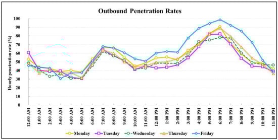 Outbound traffic also had a similar pattern; the penetration rates peaked during the morning (6:00 a.m.–9:00 a.m.) and evening (4:00 p.m.–7:00 p.m.). The penetration rates during the peak periods ranged from 50 to nearly 100 percent.