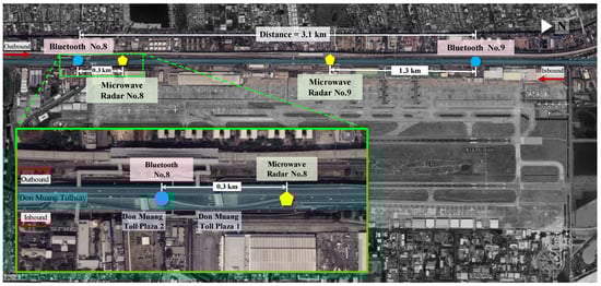 Locations of inbound Bluetooth numbers 8 and 9, microwave radars devices, and Don Muang toll plazas. Traffic moves from Bluetooth number 9 (upstream) to Bluetooth number 8 (downstream).