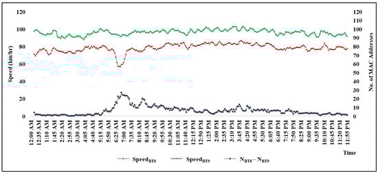 Inbound traffic data on Monday 26 October 2020 were selected for this analysis because there is typically high inbound traffic volume on Monday mornings. Figure 16 depicts 5 min average speeds at microwave radar numbers 9 (green line) and 8 (red line) throughout the day. Speeds measured at microwave radar number 9 (green line) were relatively stable (90–100 km/h) throughout the day. On the other hand, speeds measured at microwave radar number 8 (red line) ranged between 70 and 80 km/h with a speed drop (60 km/h) during the morning peak (6:00 a.m. to 7:30 a.m.). Speed at the downstream location (Bluetooth number 8) was lower than at the upstream location because the downstream location had two staggered toll plazas where drivers were required to slow down to enter toll booths.