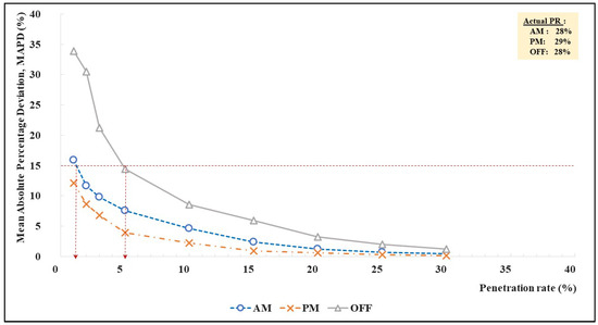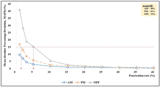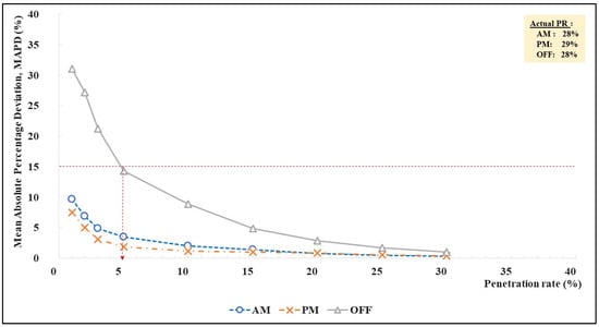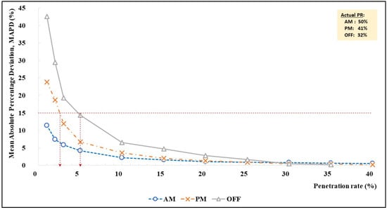 Notably, we considered an MAPD value of 15 percent as the acceptable threshold currently used by the toll road agency. For the inbound direction, the AM peak had the highest traffic volume (inbound commuting traffic to the city center in the morning) and its MAPD was under 15 percent, even with the lowest penetration rate of 1 percent (with a sample size of 26 MAC addresses/h). During the PM peak (with relatively less traffic) the MAPD exceeded the 15 percent threshold only when the penetration rate was below 1.5 percent (equivalent to 37 MAC addresses/h). In contrast, off-peak required at least 5 percent of the Bluetooth penetration rate to maintain the MAPD value of 15 percent (equivalent to 34 MAC addresses/h).