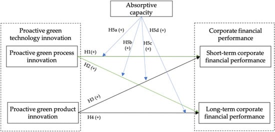 Absorptive capacity refers to a firm’s ability to harness the value of new information and apply it to business activities. Absorptive capacity thus helps transform knowledge into new products, services, or processes to support innovation. It can be argued that maintaining and improving absorptive capacity is critical to a firm’s sustainability. Therefore, absorptive capacity is often associated with innovation [66]. In their proactive green technology innovation, firms need to learn from partners, acquire external information, and integrate it into their existing knowledge base [67]. Similarly, absorptive capacity is associated with proactive green technology innovation. From a resource-based review, if a firm has valuable yet scarce resources and fully utilizes its absorptive capacity, this usually affects its competitive advantage and performance in a positive way. Absorptive capacity can help increase the speed, frequency, and scale of innovation and new knowledge to fulfil the additional knowledge requirements of firms in the process of proactive green technology innovation [68], providing a unique competitive advantage and obtaining better financial performance. It is necessary to determine the role of absorptive capacity in the relationship between proactive green technology innovation and corporate financial performance [69]; thus, we introduced the role of absorptive capacity as a moderator of the relationship between proactive green technology innovation and corporate financial performance. We hypothesize that absorptive capacity will positively moderate this relationship. The following hypotheses are proposed:
