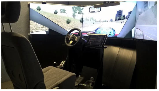 The experimental research was conducted in a purposely built MUARC Automation simulator, which was previously validated for behavioural research examining the human factors of vehicle automation [27]. The simulator consisted of a car seat and standard controls mounted on a rigid frame (Figure 1). The simulated vehicle was equipped with an automatic transmission. Visuals were presented on three 46′′ high brightness bezel-less displays. Each display had a resolution of 1080p and the image refresh rate was 60 Hz. The driver and the passenger both had a horizontal field of view of 140° and a vertical field of view of 45°. The sound was presented via left, right and centre satellite speakers and a subwoofer for reproducing low-frequency effects.