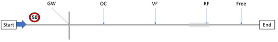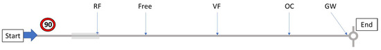 Four scenarios were developed. Scenarios 1 and 2 were created in an urban environment with a 50 km/h speed limit. The road had two lanes and three intersections. Scenarios 3 and 4 were created on a highway in a country environment with a speed limit of 90 km/h. This speed limit was chosen as the highest speed limit allowed on highways in Victoria, Australia. Each drive lasted approximately seven minutes. During each drive, participants were exposed to five distinctive events. The events were one low-complexity event (Free) and four high-complexity events (GW, RF, OC and VF). A schematic showing the order of events on a 50 km/h road is shown in Figure 2 and the order of events on a 90 km road in Figure 3.