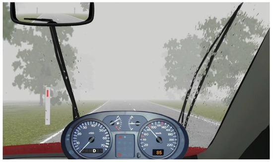 The driving mode represented two experimental conditions, manual driving and automated driving. Two distinctive levels of situation complexity (SC) were selected, low SC and high SC. These levels were presented in the form of five events in the simulator drive. One event represented low complexity and the other four high complexity. The Free (free driving) event was selected to represent a low-complexity condition as driving task demands were minimal. The free driving situation can be defined by having the free choice of lane, velocity is not affected by other cars, and there is comfortable time headway [28]. Four events were selected to represent high SC in the study: rain and fog (RF), oncoming car (OC), give way (GW), and vehicle following (VF). These four high-complexity events represented a wide variety of situations instead of relying on different levels of complexity of a single event. However, each of these four events made the driving task more demanding in comparison with the low-complexity event. The GW event forced the participant (driver) to make a gap-acceptance decision at an unsignalised intersection. The driver had to decide when to enter the intersection as there were multiple opportunities presented. The VF event aimed to expose participants to a borderline short time headway situation and therefore increased driving task demands. A mean threshold between risky and comfortable time headway (TH) in simulated driving was found to be between 1.5 and 2.0 s [29]. Therefore, TH was set to 1.5 s to increase the driver’s perception of risk without making the driving task appear unrealistic. The RF event aimed to expose the driver to low visibility and deteriorated driving conditions. Fog is recognised as one of the most dangerous conditions for drivers, and several studies confirm that such conditions contributed to the increase in driving task demands [30,31]. Finally, the purpose of the OC event was to expose participants to a latent hazard that never materialised. Latent hazards are traffic situations that experienced and alert drivers recognise as situations that have a high likelihood to develop into acute threatening situations, despite their harmless appearance at first sight [32]. The driver faced a potentially safety-critical event in which the oncoming vehicle signalised the intention to overtake, despite safe overtaking not being possible in the current situation. The third independent variable was speed, where higher driving speed was associated with an increase in driving task demands.