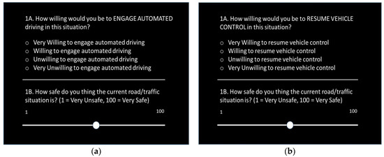 Each question point had two parts. Part A of the question required the participant to rate WTE during manual driving (Figure 5a) or WTRC during automated driving (Figure 5b). Ratings were provided on a four-point scale (1 = Very unwilling, 2 = Unwilling, 3 = Willing, 4 = Very Willing). Part B of the question rated POS of the current situation. The POS score was entered using a sliding scale, ranging from 1 for very unsafe to 100 for very safe.