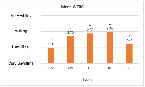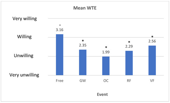 These tests compared WTE ratings at the low-complexity event (Free) with WTE ratings at high-complexity events and WTE ratings at two different speeds. The results confirmed that WTE at the low-complexity event was statistically significantly different from POS at high-complexity events. The examination of Table 3 revealed that WTE for each high-complexity event was significantly reduced when compared with the Free event. Therefore, participants were significantly less willing to engage in automated driving during high-complexity events. The comparison of mean WTE scores is illustrated in Figure 6. To enable calculation of means, each WTRC category was assigned a value as follows: 1 for very unwilling, 2 for unwilling, 3 for willing and 4 for very willing.
