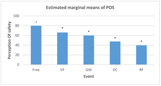 Results revealed that there was a statistically significant difference in POS ratings between the low-complexity event and each of the high-complexity events. Estimated marginal means of POS for each event, sorted in descending order, are illustrated in Figure 8. The POS score for the Free event was the highest, whereas the POS score for the RF event was the lowest. The model predicted a difference of 40 rating points between the POS score at the Free event and the POS score at the RF event.