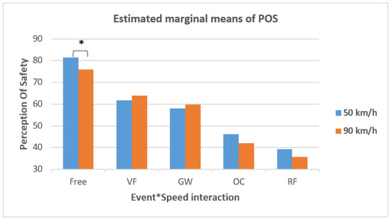 Estimated marginal means of POS for the interaction of event (SC) and speed (* p < 0.05).