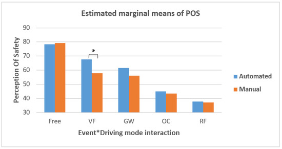 Estimated marginal means of POS for the interaction of event (SC) and driving mode (* p < 0.05).