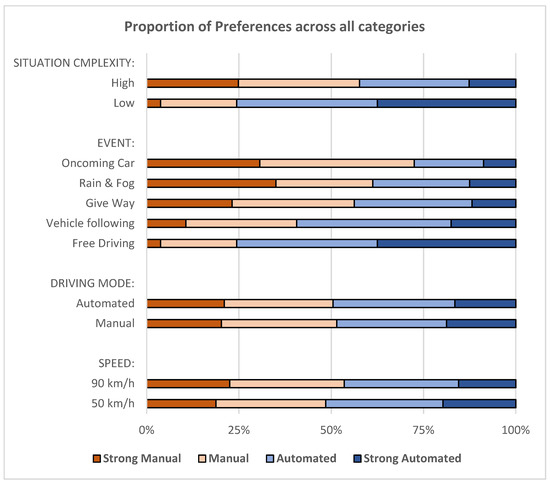 The overview of proportions of driving mode preferences for all categories and events is illustrated in Figure 11. Each preference level is colour-coded, and counts are presented as percentages of the total number of selections for each category.
