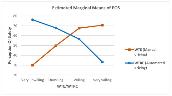 A very strong association of POS and WTE/WTRC was confirmed. Therefore, it was concluded that POS can be used as a predictor of a driver’s WTE/WTRC. Although no comparable studies that measured POS in AVs were found, some similarities can be identified with the results of surveys on AVs. Assuming that the measurement of safety is opposite to the measurement of risk [39], the association of POS and WTE/WTRC was indirectly supported by finding that risk perception had a significant impact on the interest in using an automated vehicle [43].