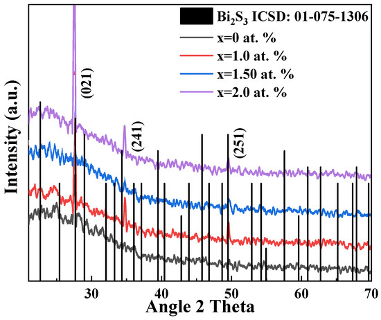 The recent boom in population along with environmental and geophysical issues are forcing to switch from fossil fuels to green and sustainable energy resources [1,2,3]. To cope with this demand, there is a need to search and design new materials for renewable technologies [4,5,6]. Doping emerged as a powerful tool in the quest of designing new materials, especially for photovoltaic applications. As it can assist in improving the optoelectronic behavior by manipulating the characteristic properties of the parent material [7,8,9]. Due to its high incoming photon to electron conversion efficiency, bismuth sulphide (Bi2S3) thin films are gaining a lot of interest as a component of solar cells. The superior absorption coefficient (α > 105 cm−1) in the visible region [10] n-type electrical conductivity [11] and good structural and chemical stability [12]. According to Beer lambert’s law, Bi2S3 thin films with 200 nm thickness can absorb 95% of incident radiation. They have a direct optical band gap of 1.2–2.0 eV [10] depending on the method of sample preparation and crystal quality [13]. But its high resistance of Bi2S3 thin films can be reduced by increasing the carrier mobility with the help of doping.