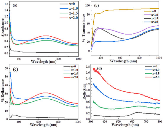 For doped and undoped materials, the fluctuation of absorbance (A) and % transmittance was investigated in the 300–1000 nm region. The doped thin films’ strong absorbance in the 400–900 nm range, as illustrated in Figure 4a, suggests that they might be used as absorber layers in solar cells [28]. Figure 4b shows that binary bismuth sulphide thin film exhibited high transmittance i.e., more than 80%, although high transmittance values for thin-film reflect good surface homogeneity [32] which was reduced down to 40% upon doping. Figure 4c,d depicts the % age reflectance and reflection respectively.