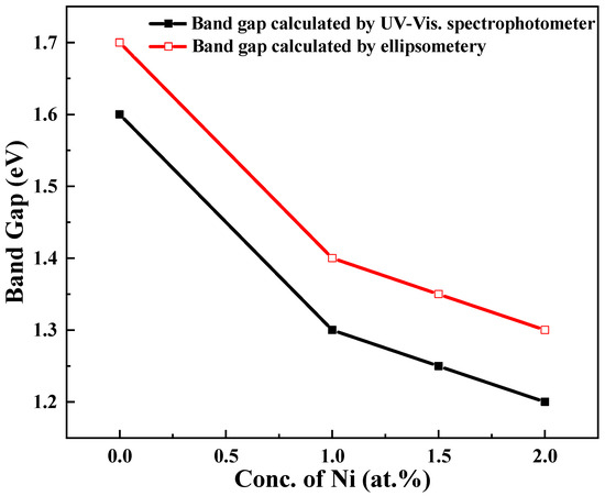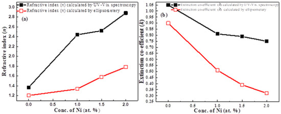 Table 2 compares the results determined by UV-Vis. spectroscopy and ellipsometric spectroscopy with the influence of Ni content on refractive index and extinction coefficient. Using UV-vis spectroscopy data, the values of the refractive index and extinction coefficient were estimated using formulae.