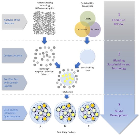 The start of this research trajectory commenced with an examination of “sustainability capabilities” [62,120], the remit of which was to define, shape and refine the observational “lens” [121]. In this context, the lens was the fulcrum interface between sustainability principles and the technology diffusion processes. This, by default, included the organisational dynamics and decision-making processes underpinning these, where it was acknowledged that the technology diffusion process ostensibly takes place through social systems and structures [91]. With one or two exceptions, the literature review was confined to publications dating from 1990 to date (2022). This constraint was applied in order to focus on currency, given that the main emphasis of this work needed to determine the main drivers of the technology diffusion process. In this respect, the focus was placed on peer-reviewed journals within AEC, supported by the literature from other fields, including management, social sciences and information systems (IS). This included parameter keys such as “technology diffusion”, “technology adoption”, “innovation diffusion”, “ICT diffusion” and “ICT adoption”. Figure 2 presents the process steps of this research.