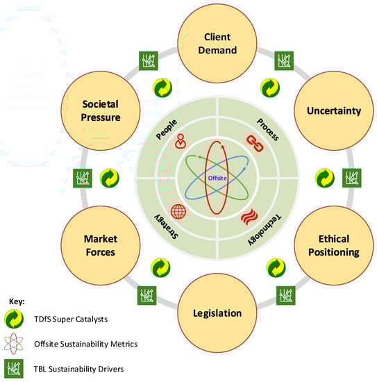 Figure 4 presents an outline structure for organisations wishing to understand the organisational dynamics, forces and constraints affecting TBL for offsite projects. In this respect, offsite is therefore placed at the heart of this relationship model as the governing vision and ethos of this influences all other activities. The secondary sphere includes four governance areas, notably: People, Process, Technology and Strategy [186]. These four spheres allow organisations to target influence points to support the product offering, in this case, the offsite solutions it has in the market. The next orbit around these four spheres is the TDfS Super Catalysts. These act as gateway measures by providing criteria for assessment. In simple terms, they act as filters to the final outer orbit, which includes six final spheres: “Client Demand”; “Uncertainty”; “Ethical Positioning”; “legislation”; “Market Forces”; and “Societal Pressure”. These six outer spheres are considered external drivers to the central core (offsite). In this respect, they are issues that the company has to directly address in order to deliver their market offering—ergo, their offsite product(s). In this respect, these six spheres are all interlinked by “TBL Sustainability Drivers”, where each of these six spheres provides specific TBL criteria the company needs to consider/address as part of its product offering. These outer spheres were derived from the organisational technology adoption and diffusion drivers (Table 3), where the importance and need for these are reinforced in the literature [6,187,188]. The outer spheres act as governors, where they both shape and define the external market drivers. In this respect, the TDfS Super Catalysts provide the criteria for assessment and the People, Process, Technology and Strategy orbits act as focal points for this assessment. The corollary of this is that from an organisational perspective, organisations have a clear set of indicators and metrics to help them position their products and services. In doing so, they can not only provide tangible evidence to support TDfS criteria but also enhance their offsite offering with defined value-chain indicators.