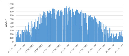 Using Equation (7), we can replace the first two formulas in Equation (5). The reflected irradiation under cloudy conditions, again, is computed using from Equation (7) and the Albedo function (6) in Equation (5). Eventually, we yield under cloudy conditions as the sum of and under cloudy conditions. Via Equations (1)–(3), the power output is eventually computed.