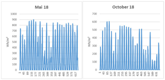 Hourly global solar irradiation from Ulm in May and October 2018.
