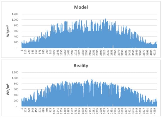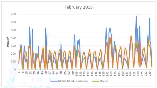Differences in the summertime are comparably lower than differences in wintertime, which is significant for assessing our model. In the summertime, irradiation values are higher, so we have more resulting photovoltaic power. Smaller model errors mean that simulations reflect better the true conditions in these months; hence, we can consider them more reliable. Considering the February data, we see that we underestimate irradiation values on days with comparably intensive sunshine. This might be due to an underestimation of reflexive irradiation due to snow, for example.