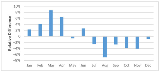 On a monthly level, relative differences between the modeled and true irradiation amounts are maximum around plus/minus 8%, as shown in Figure 6. Consequently, given unbiased temperature simulation, we slightly overestimate photovoltaic power amounts in March and underestimate them in August. The rest of the months, especially May and December, show comparably smaller relative differences.