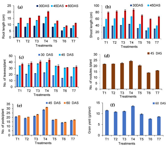 Reflection of seed-borne yeast isolates on growth and yield of black gram treated with Rhizobium sp. BMBS 1 and challenged with R. solani. (a) Shoot length; (b) root length; (c) number of leaves; (d) number of nodules; (e) number of pods; (f) grain yield (values are the average of triplicates). DAS = Day after sowing T1—I.terricola GRY4 + Rhizobium sp. + R. solani MTCC 4633, T2—P. kudriavzevii POY5 + Rhizobium sp. + R. solani, T3—I. terricola GRY4 + R. solani, T4—P. kudriavzevii POY5 + R. solani MTCC 4633, T5—Rhizobium sp. BMBS1 + R. solani, T6—R. solani, and T7—uninoculated control.