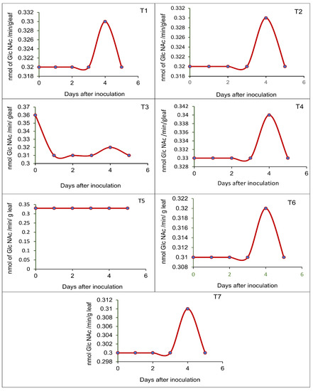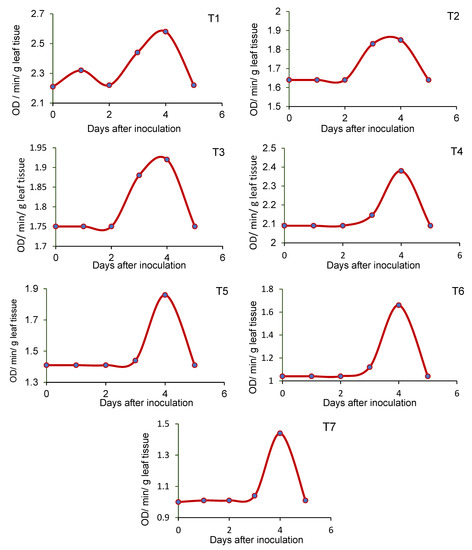 Leaves from three-week-old plants infected with R. solani were collected on 0, 1, 2, 3, 4, and 5 days after challenge inoculation. The collected samples were analyzed for the defense enzymes. Peroxidase activity (POD) was assayed spectrophotometrically through an increase in optical density due to guaiacol’s oxidation to tetra-guaiacol. It was expressed as µmol tetra-guaiacol formed/min/g fresh weight [47]. Spectrophotometric polyphenol oxidase (PPO) enzyme assay measured pheomelanin formation from different phenolic substrates. It was expressed as a change in absorbance/min/g of leaf tissue [48]. Catalase (CAT) enzyme assay was performed as per Chaparro-Giraldo et al. [49]. Plant chitinase enzymes hydrolyze the chitin polymer consisting of N-acetyl glucosamine (GlcNAc) units and play antifungal activities against many fungi. They were expressed as nmol GlcNAc equivalent/min/g of leaf tissue [50].