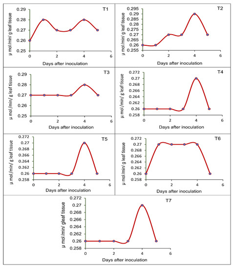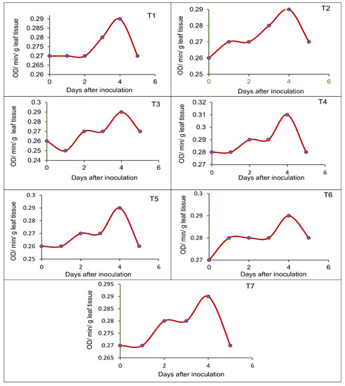 Catalase activity was higher in the combined inoculation of Pichia kudriavzevii POY5 + Rhizobium sp. BMBS1 along with R. solani (0.29 µM/min/g leaf tissue) compared to R. solani (0.27 µM/min/g leaf tissue) at day 4 of the challenge inoculation. The catalase enzyme activity was enhanced by yeast inoculation and a combination of yeast and Rhizobium sp. BMBS1 and pathogen challenge inoculation to the tune of 3.7–7.4% over inoculation of pathogens alone (Figure 4).